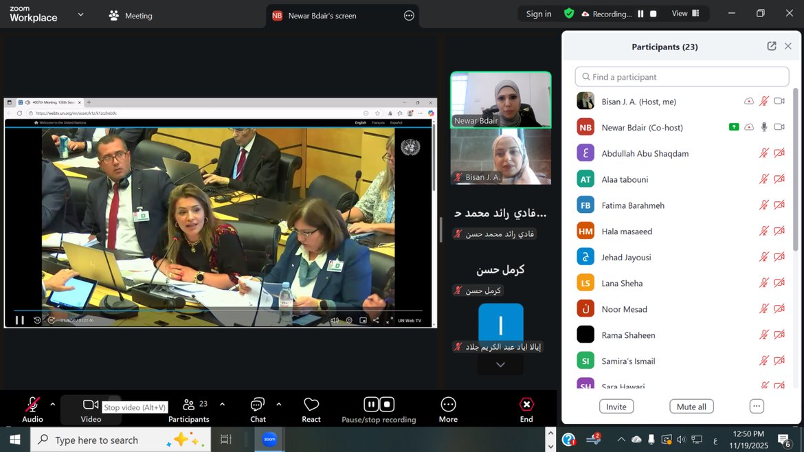 نظم المعهد الفلسطيني للقانون الدولي الإنساني وحقوق الإنسان بكلية القانون والعلوم السياسية في جامعة النجاح الوطنية محاضرة متخصصة عبر زوم حول آليات متابعة معايير حقوق الإنسان في إطار الأمم المتحدة ومجلس حقوق الإنسان قدمتها أ. نوار بدير من مؤسسة الحق وذلك يوم الأربعاء الموافق 19/11/2025، وذلك في إطار الأنشطة التعليمية التفاعلية لطلبة مساق حقوق الإنسان والعلاقات الدولية في كلية القانون.